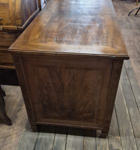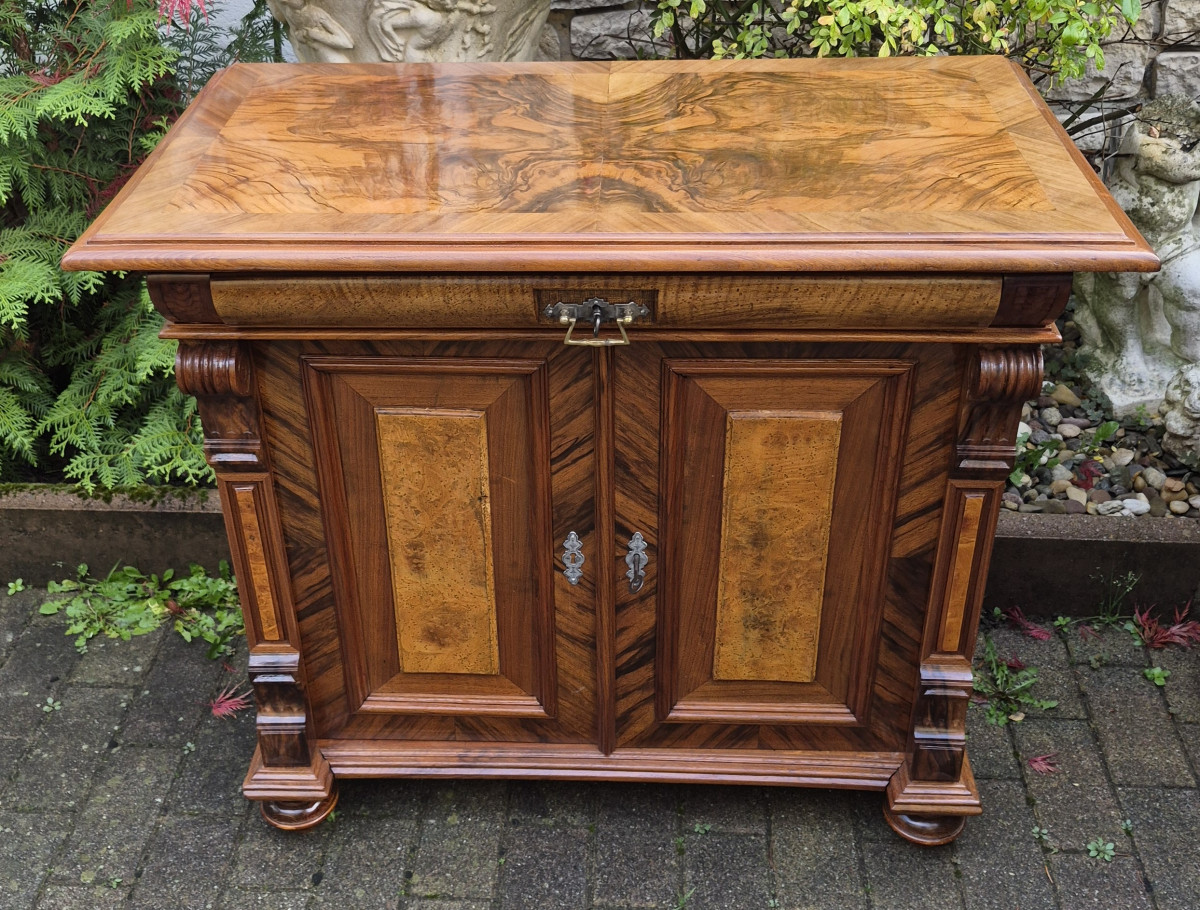 Dieses außergewöhnliche Stück mit dem eindrucksvollen Furnierbild wurde aufwändig restauriert und mit einer Schellack Handpolitur versehen.