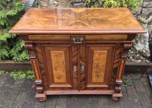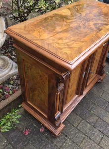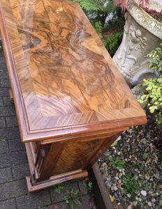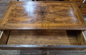Dieses wunderschöne Schmuckstück mit den tollen Furnierbild wurde aufwändig restauriert und mit einer Schellackpolitur versehen.