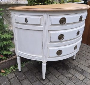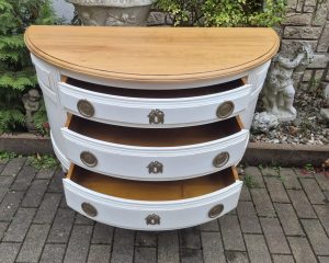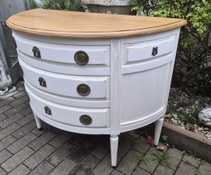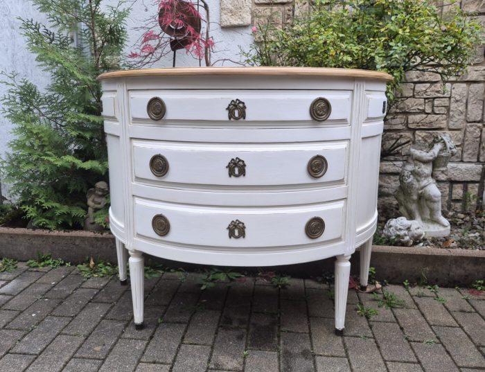 Diese ausgefallene halbrunde Kommode ist restauriert und in shabby weiß gefasst, die Platte ist gewachst.