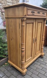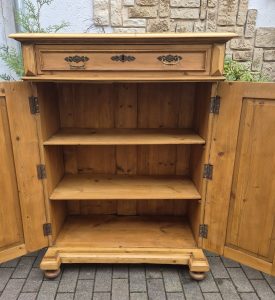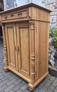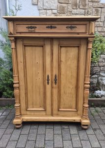 Dieses klassische Stück aus der Gründerzeit ist frisch restauriert und gewachst. Es besticht durch seine zeittypischen Merkmale und seine Funktionalität und verfügt über zwei Einlegeböden hinter den Türen.