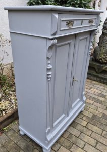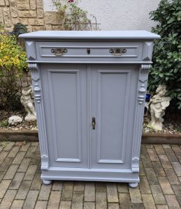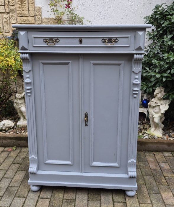 Dieses klassische Vertiko wurde restauriert und in hellgrau gefasst.