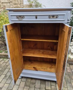 Der Kasten wurde restauriert und in shabby grau gefasst, er ist ein Hingucker und vielseitig verwendbar.