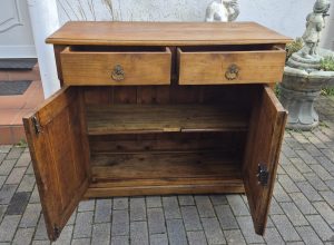 Sie hat zwei leicht laufende Schubladen und hinter den beiden Türen einen Einlegeboden.