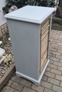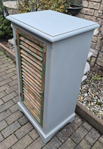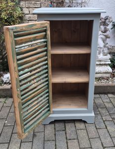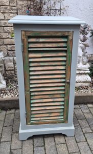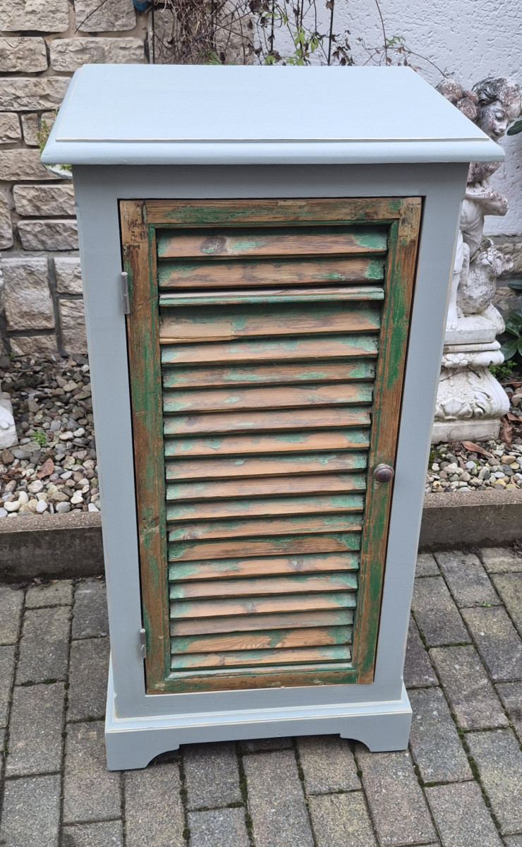 Dieser schöne kleine Schrank wurde neu hergestellt und mit einer alten Lamellentür versehen. Er ist in graublau gefasst und verfügt im Innenraum über zwei Einlegeböden. Er eignet sich gut als Geschirr-, Bücher- oder Wäscheschrank und findet durch seine geringe Größe überall einen schönen Platz.