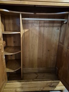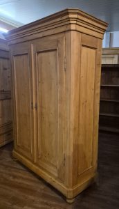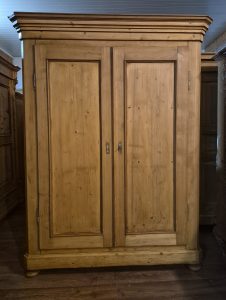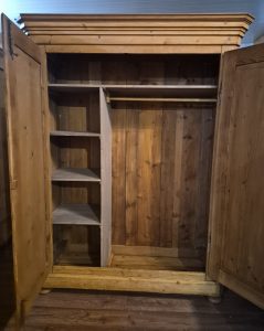 Der Teisendorfer Schrank ist ein antikes Möbelstück, er bietet viel Platz für Kleidung und hat im Inneren eine Kleiderstange.