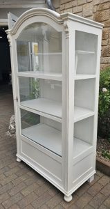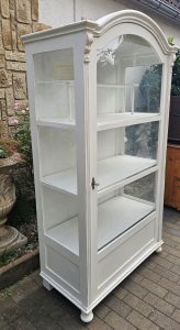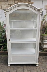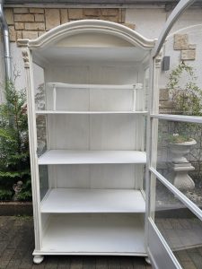 Diese Vitrine wurde restauriert und in shabby weiß gefasst. Sie hat eine Glastür, dahinter drei Einlegeböden und auf dem ersten Boden eine schmale Ablage.