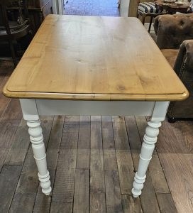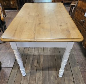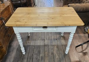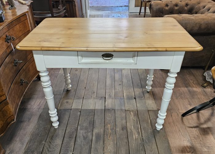 Dieser schöne Esstisch aus Weichholz wurde restauriert, das Gestell ist in shabby weiß gefasst, die Platte ist gewachst. Der Tisch steht stabil und er hat eine praktische Schublade unter der Platte.