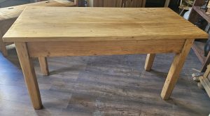 Dieser schöne schlichte Esstisch aus Weichholz wurde restauriert und gewachst. Er steht stabil und hat eine praktische Schublade unter der Platte.