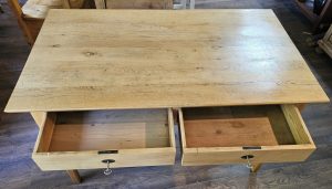 Dieser schöne schlichte Esstisch steht stabil und hat zwei praktische Schubladen unter der Platte.