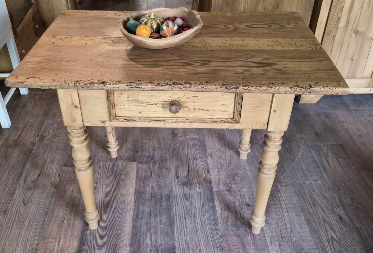 Dieser schöne urige Tisch aus Weichholz um 1880 wurde restauriert und gewachst. Er hat Spuren eines ehemaligen Wurmbefalls, der aber behandelt wurde (Wärmekammer). Der Tisch steht stabil und hat eine praktische Schublade unter der Platte.